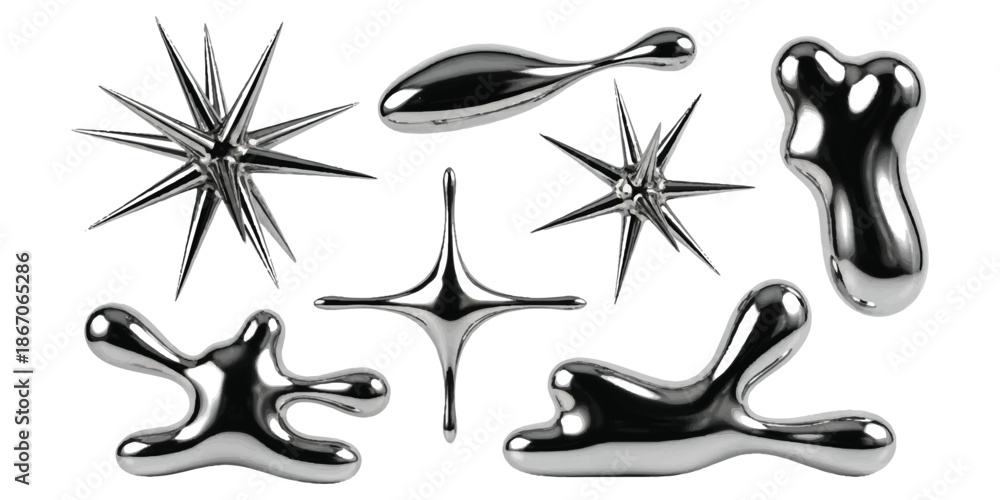 • A captivating collection of abstract chrome 3d shapes showcasing fluid and spiky metallic forms