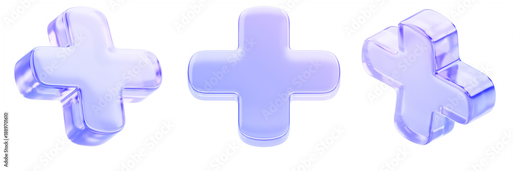 • 3d set of holographic glass cross symbols. Health icons with purple blue gradient for medical app, healthcare website, hospital or pharmacy design. Math plus sign, addition operation