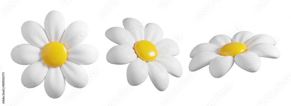 • Cute 3D plastic Daisy Flower. Cartoon chamomile bubble bloom with white petals for spring and summer design. 3d render