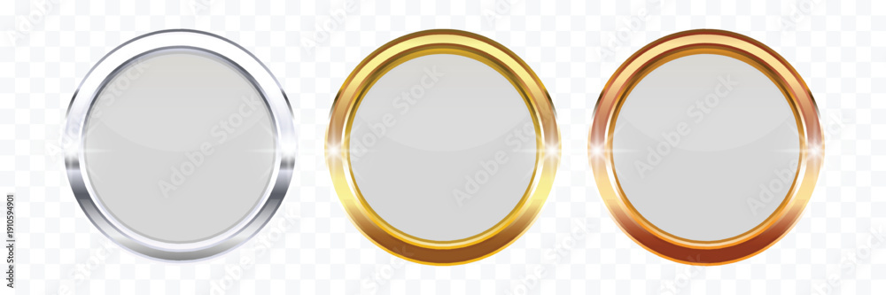 • Gold Silver and Bronze Round Button Frames – 3D Glossy Metallic Circle UI UX User Interface Borders Isolated on Transparent Background Vector Illustration