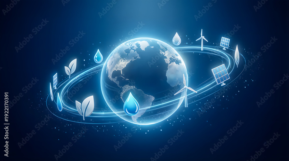 • Glowing Earth globe surrounded by floating eco-friendly icons and renewable energy symbols.