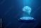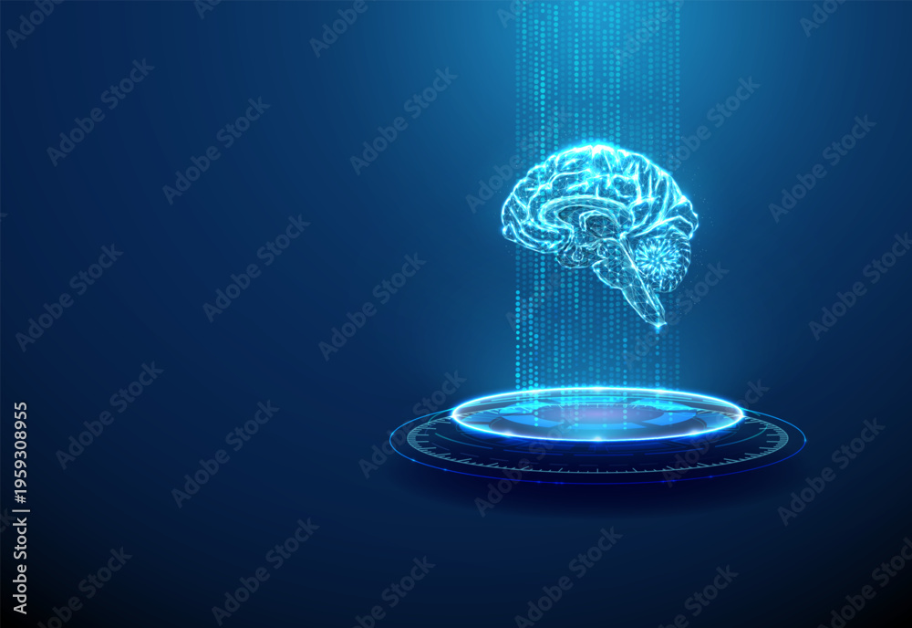• Blue 3d human brain on futuristic podium in data stream. AI, neuroscience research, advanced healthcare technology, human intelligence innovation concept.