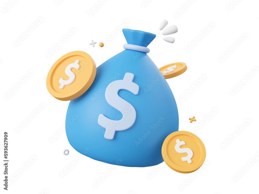 • 3d cartoon design illustration of Money bag and dollar coin, Money savings concept.