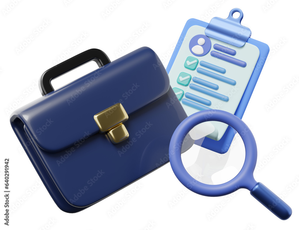 • 3d job search illustration. Interview approved document on clipboard, checklist, employee briefcase, magnifier glass isolated on transparent. job recruitment banner concept. 3d render cartoon icon.