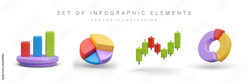 • Set of realistic infographic elements in different style. Histogram, pie chart and round diagram in green, yellow and purple colors. Vector illustration in 3d style