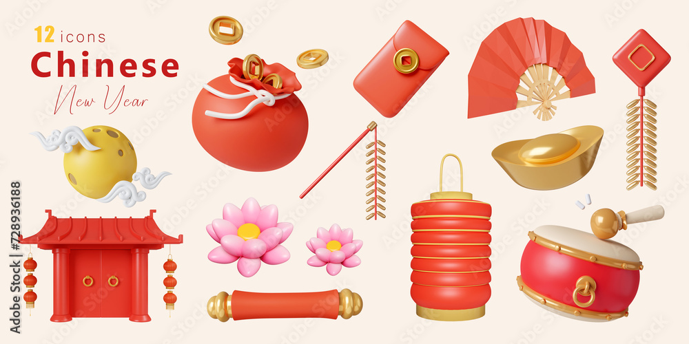 Naklejka na stół i biurko - 3d Chinese New Year Elements icon set. 3d rendering illustration. Clipping path. #728936188