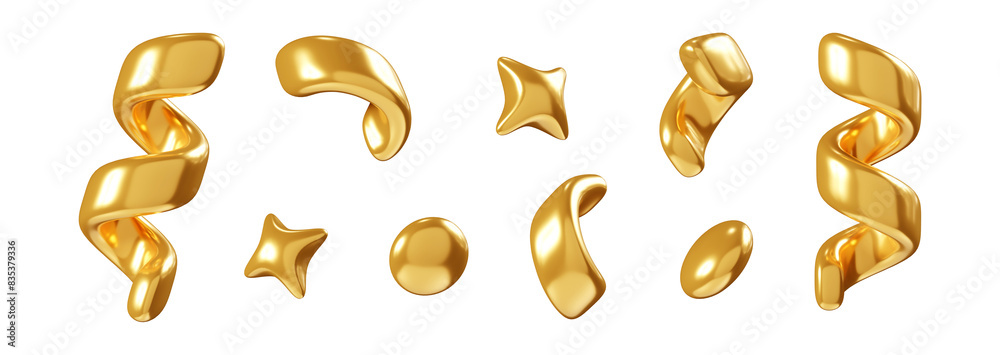 • Birthday party popper golden confetti streamer element. 3d render illustration set of surprise or winner congratulation gold serpentine ribbon. Fly and float party decor after explosion of firecracker