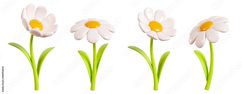 Naklejka na stół i biurko - Daisy plastic flower with white petals, green stem and leaf in different angles of view cartoon... #846956676