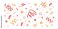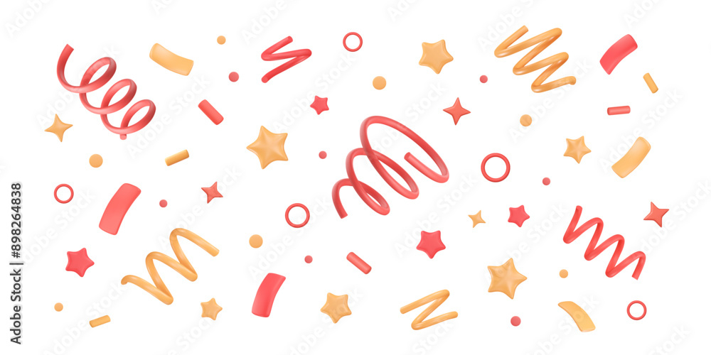 • Background with 3d confetti. Fireworks of serpentine, tinsel, stars and dots. Holiday horizontal wallpaper. Event decoration. Cartoon firecracker elements. Vector isolated illustration.
