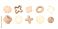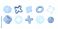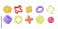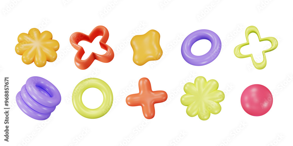 • 3d plastic playful elements. Joyous shapes. Circles, tube, cross object, abstract volumetric flower icon, ball. Vector creative graphics. Geometric forms. Cartoon illustration.