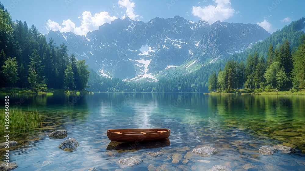 Naklejka na szafę - Scena krajobrazowa spokojnego jeziora otoczona górami i bujnym zielonym lasem #1265860505