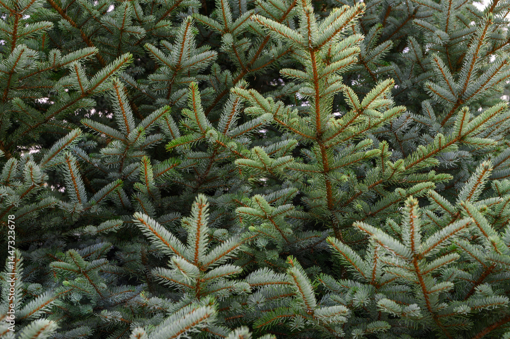 Naklejka na szafę - Świerk zbliżenie na igły gałązka rosnące na drzewie, kadr wypelniony leśne tło #1447323678