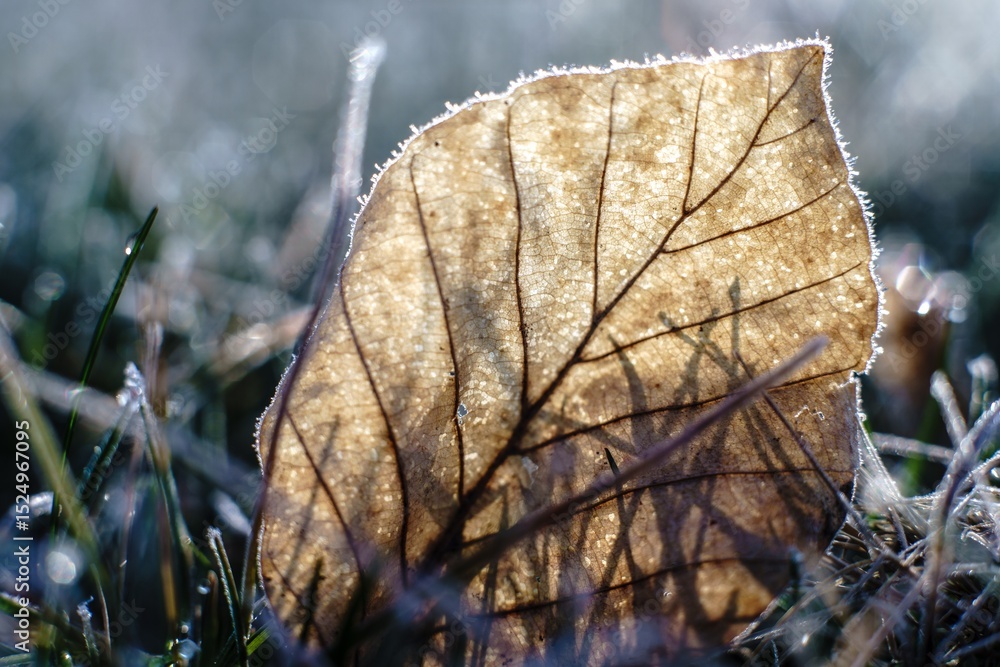 suchy jesienny liść na zmrożonej trawie pokrytej szronem