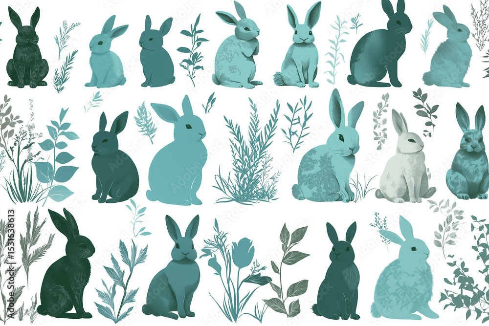 • Kolekcja uroczych królików w różnych odcieniach zieleni i błękitu, otoczonych roślinnością, tworząca dekoracyjny wzór. Idealne do projektów wiosennych.
