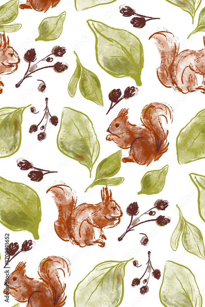 • Wzór z bukowymi liśćmi, szyszkami i wiewiórkami do leśnych dziecięcych wnętrz.