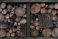 • Hotel dla owadów, rewno i szyszki ułożone za metalową siatką - naturalna tekstura
