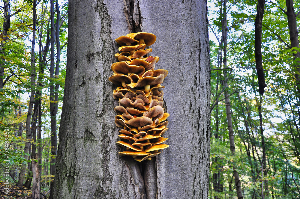 Naklejka na szafę - Uderzająca, pionowa kępa pomarańczowo-brązowych grzybów pnących się po pniu drzewa, prezentująca... #1784893521