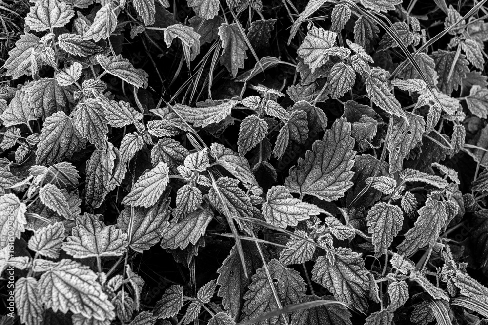 Naklejka na szafę - Czarno-białe tło zmrożonych liści. Tekstura natury pokryta szronem w zimowy poranek. #1816099368
