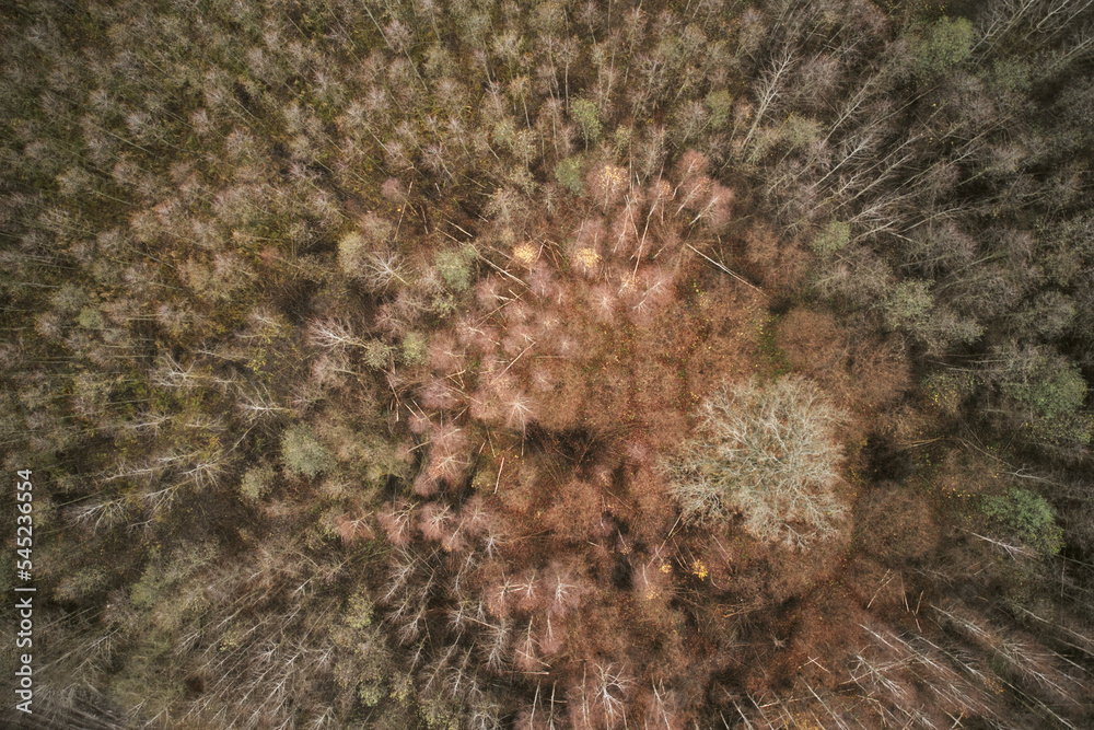 Las - pnie świerków pozbawione gałęzi. Drzewa tworzące pionowe linie. Naturalny krajobraz lasu świerkowego.