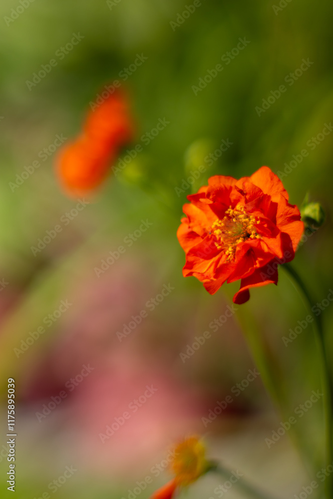 • Kuklik szkarłatny (Geum Chiloense ‘MRS BRADSAW’ ), czerwone kwiaty wiosenne, zielone tło, wzór w kwiaty, tapeta kwiatowa