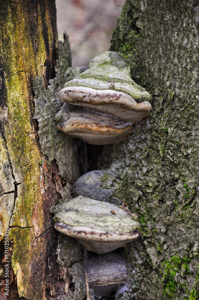 Naklejka na drzwi - Grzyby konsolowe (huby) przylegają do porośniętego mchem pnia drzewa, odsłaniając szorstką korę,... #1710255916
