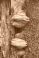 • Grzyby konsolowe (huby) przylegają do porośniętego mchem pnia drzewa, odsłaniając szorstką korę, bogatą fakturę i naturalny rozkład. Z bliska studium geologii lasu, wzrostu organicznego i natury.