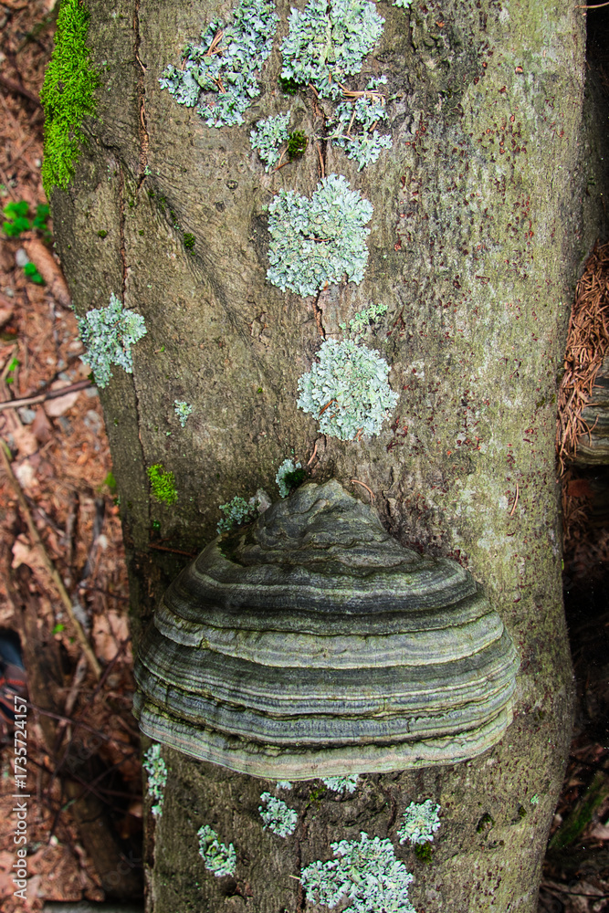 • Dvorský les (Rýchory, Krkonoše) rezerwat przyrody. Zbliżenie na zwietrzały pień drzewa z bladymi, niebiesko-zielonymi skupiskami porostów i wyraźnym grzybem półkowym z koncentrycznymi pierścieniami.
