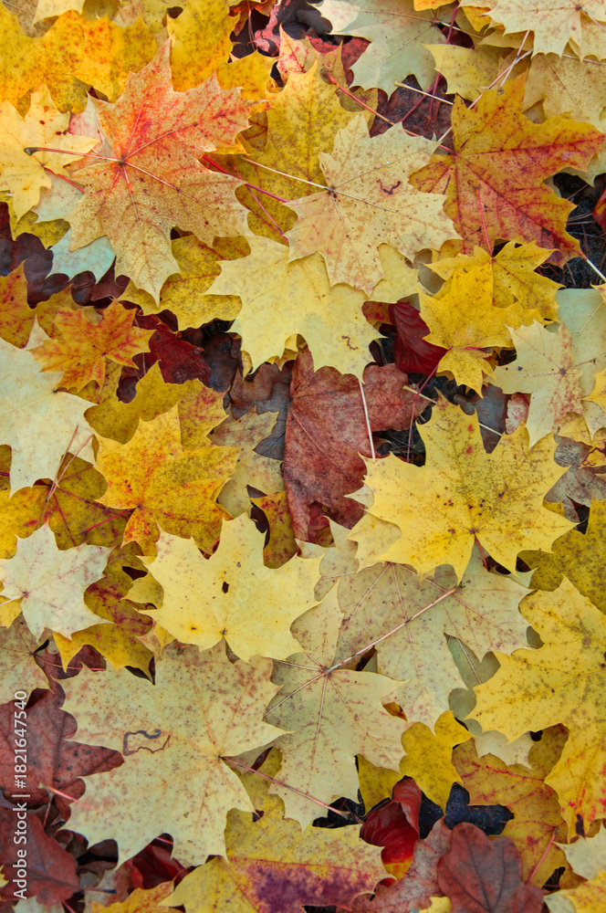 Naklejka na drzwi - Ciepłe odcienie liści klonu w żółci, pomarańczy i czerwieni tworzą kolorową jesienną scenerię. #1821647540