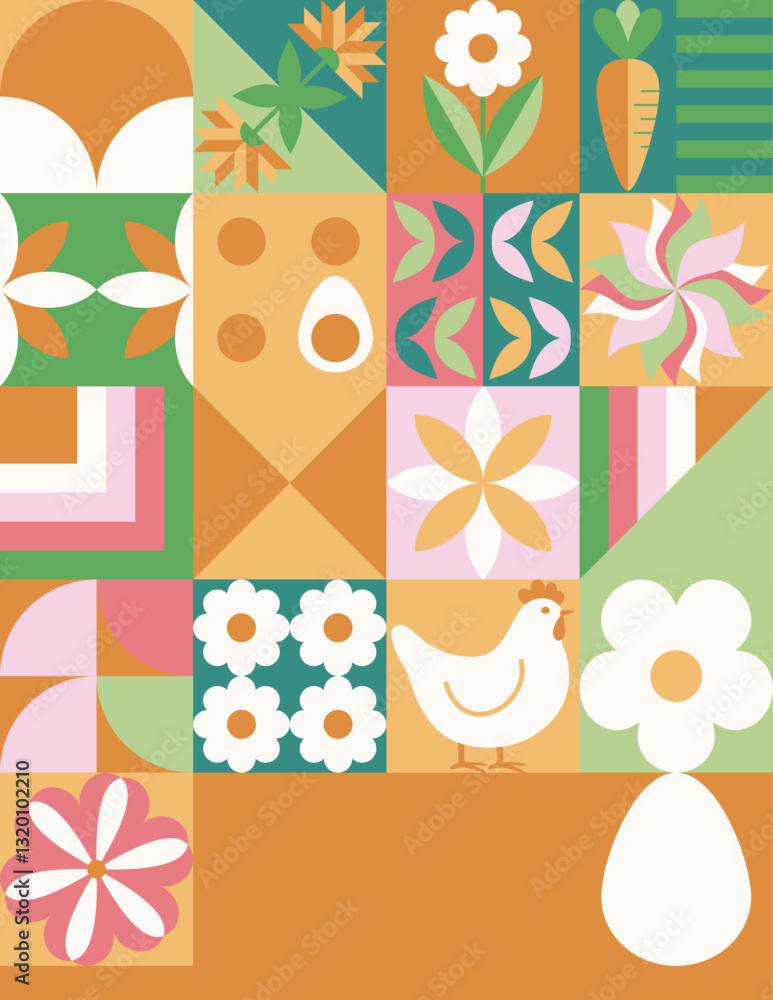 • Wielkanocna pocztówka z mozaiką z świątecznymi symbolami. Wiosenny geometryczny wzór z królikiem, jajkami i kwiatami.