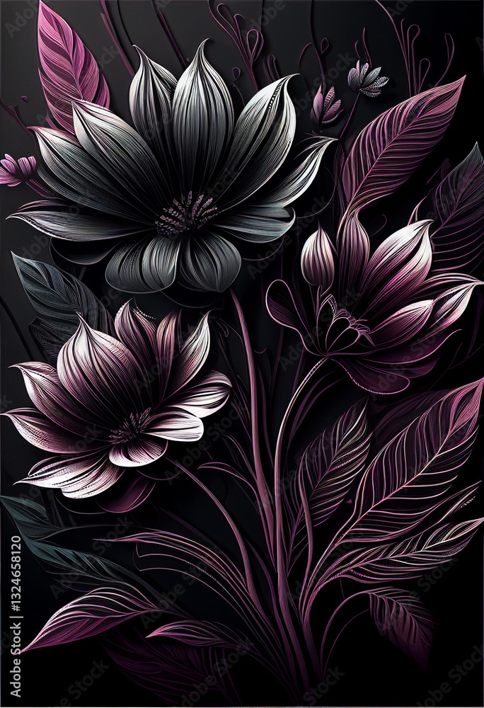 • Luksusowa ilustracja kwiatowa – złoto-fioletowy wzór na czarnym tle, elegancka roślinna grafika, artystyczna kompozycja w stylu glamour, dekoracyjna sztuka cyfrowa, florystyczny ornament, romantyczny