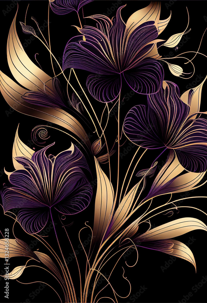 • Luksusowa ilustracja kwiatowa – złoto-fioletowy wzór na czarnym tle, elegancka roślinna grafika, artystyczna kompozycja w stylu glamour, dekoracyjna sztuka cyfrowa, florystyczny ornament, romantyczny