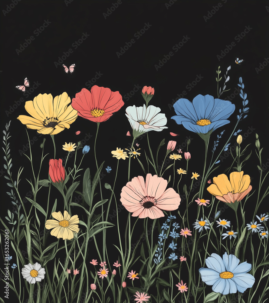 • Ilustracja łąki pełnej kolorowych, dzikich kwiatów i motyli na czarnym tle. To jest jaskrawy, graficzny wzór. Idealny do projektów tekstylnych.