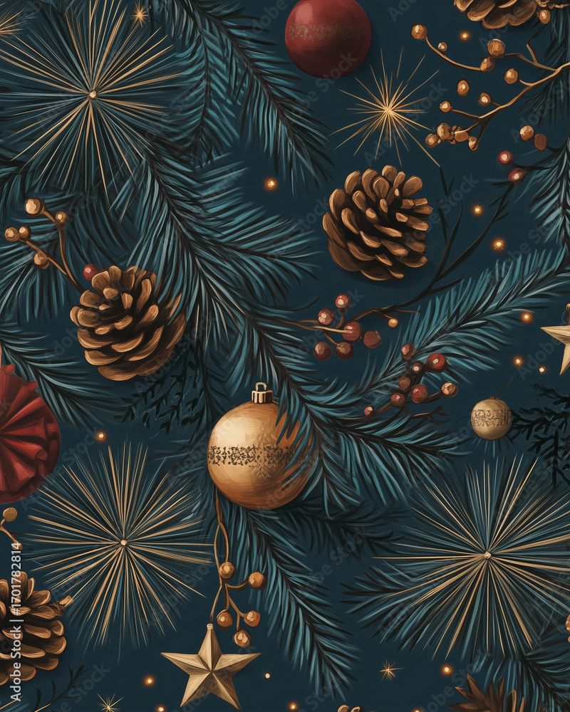 • Elegancki, bożonarodzeniowy wzór z gałązkami jodły, szyszkami i złotymi ozdobami. Abstrakcyjna kompozycja idealna na tło lub opakowania prezentów.
