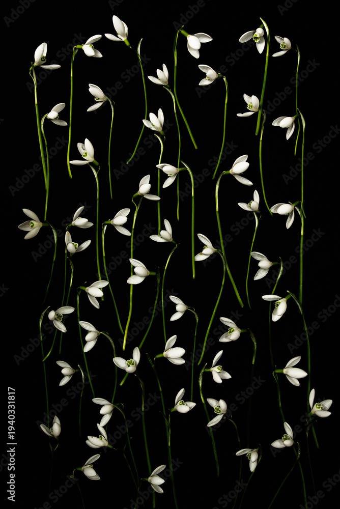 • Przebiśniegi ułożone na czarnym tle – wiosenne kwiaty w minimalistycznej kompozycji, kwiatowy wzór