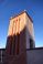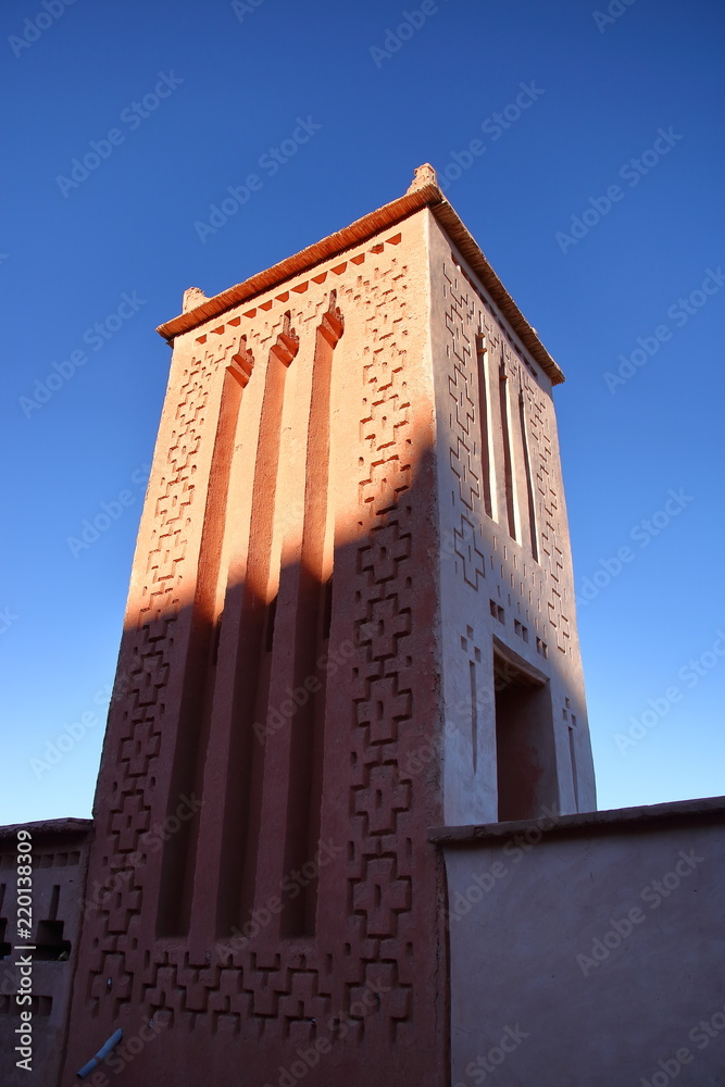 • Pięknie dekorowany fragment budowli z gliny pise w tradycyjnym marokańskim stylu, wieża i mur, na wieży ładnie maluje się cień, niebieskie niebo
