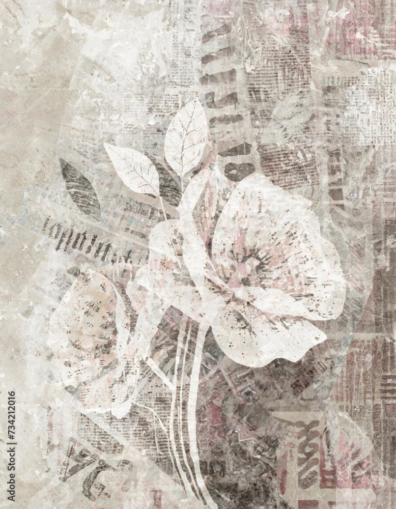 • Tło, tapeta motyw kwiatowy i gazetowy kolaż w podwójnej ekspozycji. Generative AI