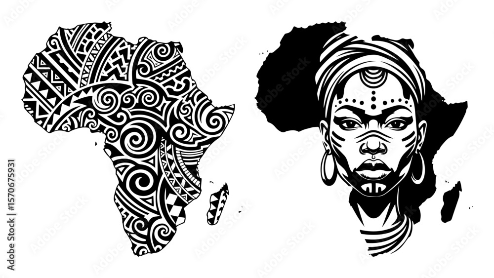 • africa tribal pattern map with woman portrait line art illustration
