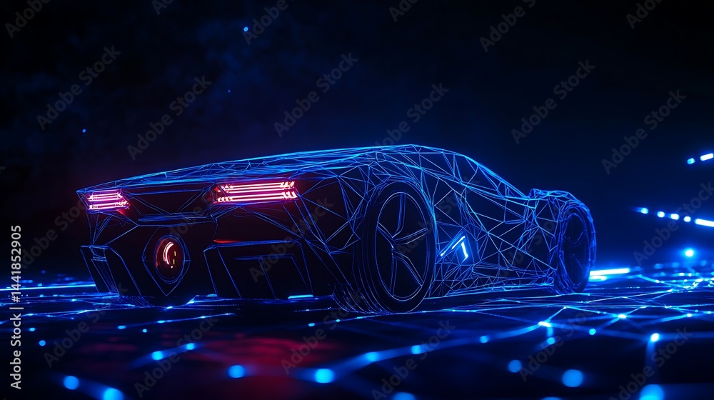 Plakat do Fitness Clubu - Futuristic glowing sports car rear view with digital wireframe design #1441852905