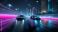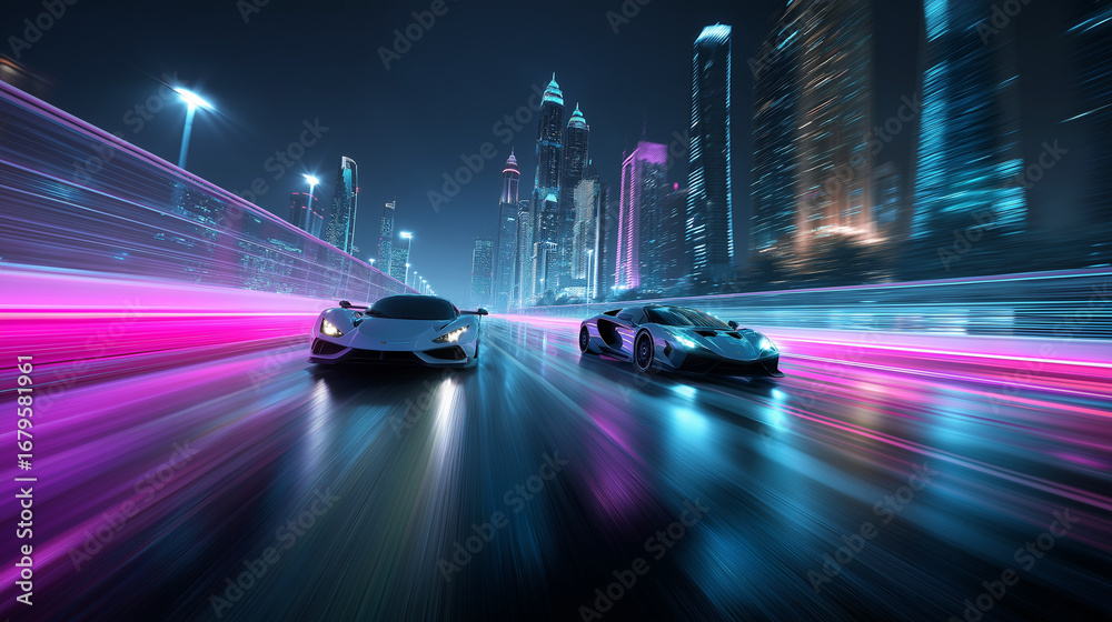 • Two racing sports cars speed down a neon-lit road, capturing adrenaline, motion, and the futuristic thrill of high-speed performance.