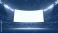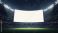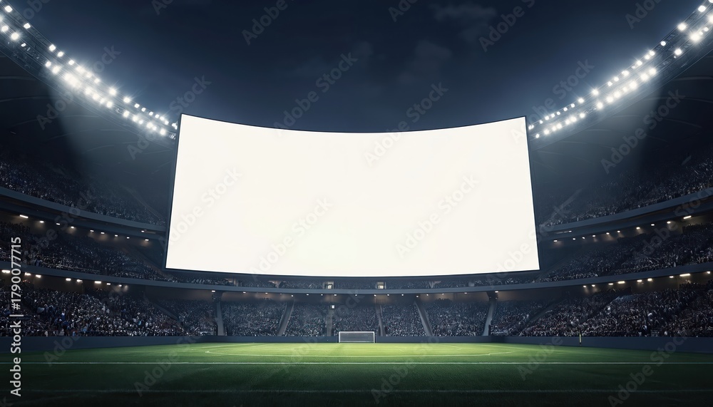 • Blank big screen in stadium at night with lights. Arena with empty display billboard for advertising. Mockup template background for sport event or football match. Place your text on screen.