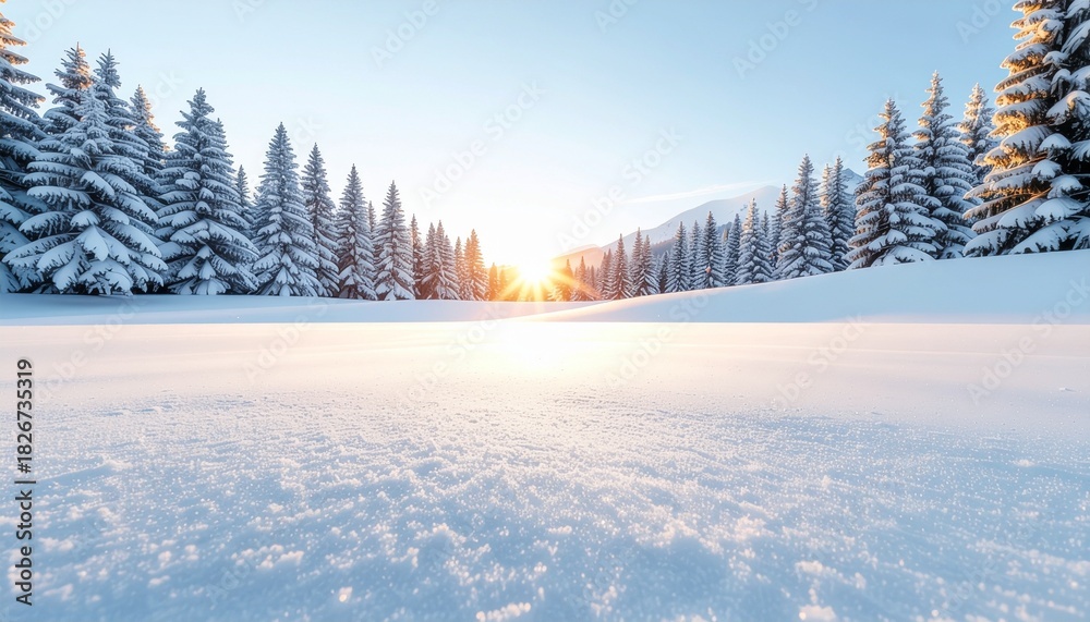 • Piękny zimowy krajobraz ze śniegiem i oszronionymi drzewami oświetlony promieniami słońca
