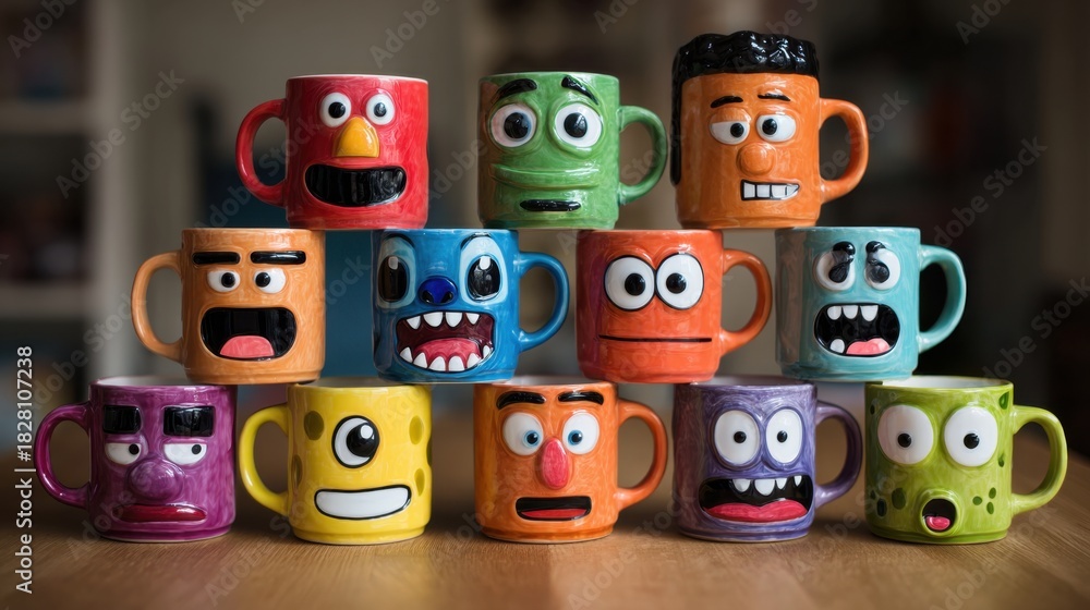 A stack of colorful mugs with faces on them. The mugs are arranged in a pyramid shape, with the topmost mug being the most colorful. The faces on the mugs are of various characters, including Elmo od 0,00 zł Dopasuj i kup Obraz