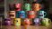 A stack of colorful mugs with faces on them. The mugs are arranged in a pyramid shape, with the topmost mug being the most colorful. The faces on the mugs are of various characters, including Elmo od 0,00 zł Dopasuj i kup Dekor szklany