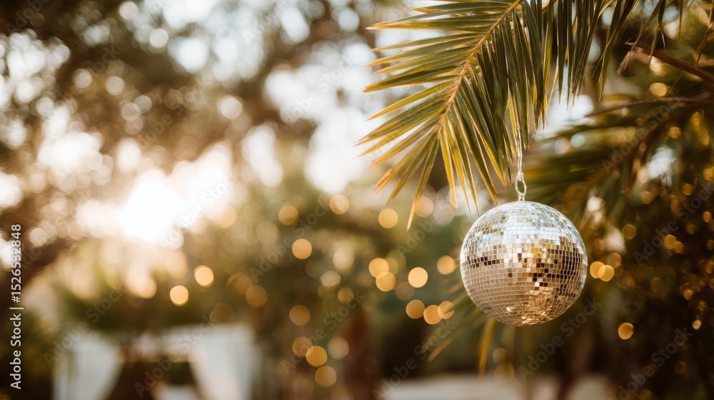 Lowangle view of a silver disco ball hanging from a palm frond in tropical sunlight with reflective golden and green hues, creating a festive and vibrant atmosphere, copy space on left od 0,00 zł Dopasuj i kup Obraz
