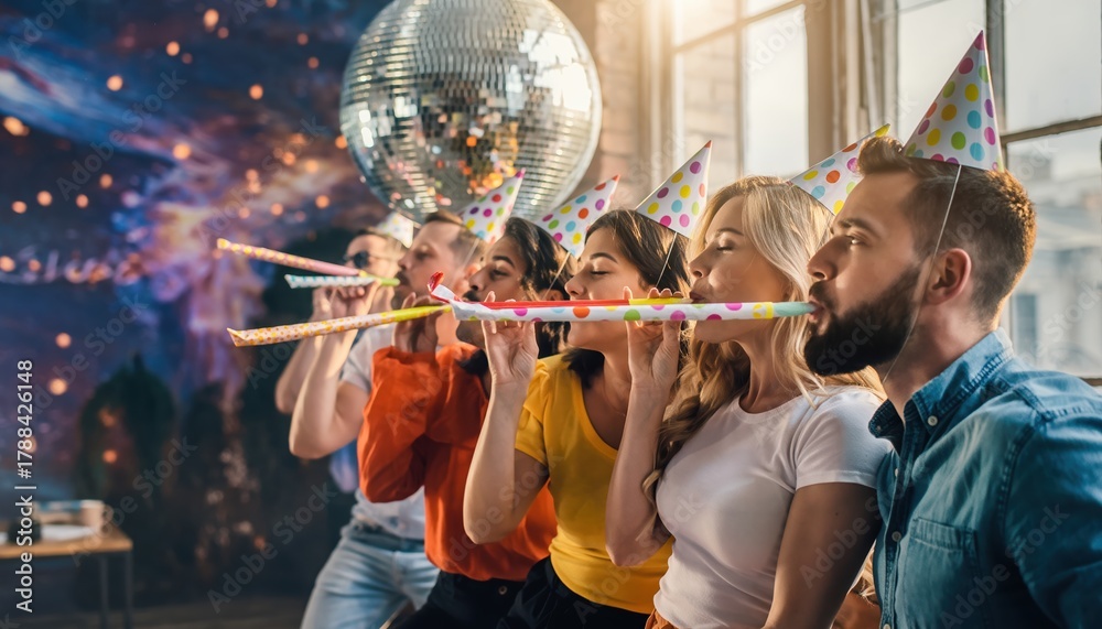Plakat do Szkoły Tańca - Friends celebrate with party blowers and disco ball. #1788426148