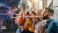 A colorful disco mirror ball illuminates the backdrop of a nightclub. The party lights up the disco ball.