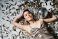 Young woman in stylish outfit poses gracefully among shiny confetti and a disco ball
