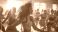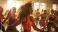 A colorful disco mirror ball illuminates the backdrop of a nightclub. The party lights up the disco ball.