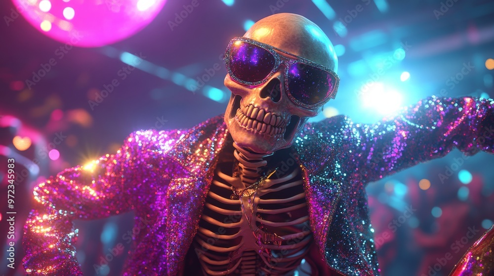 • Skeleton wearing sunglasses is dancing in nightclub with disco ball