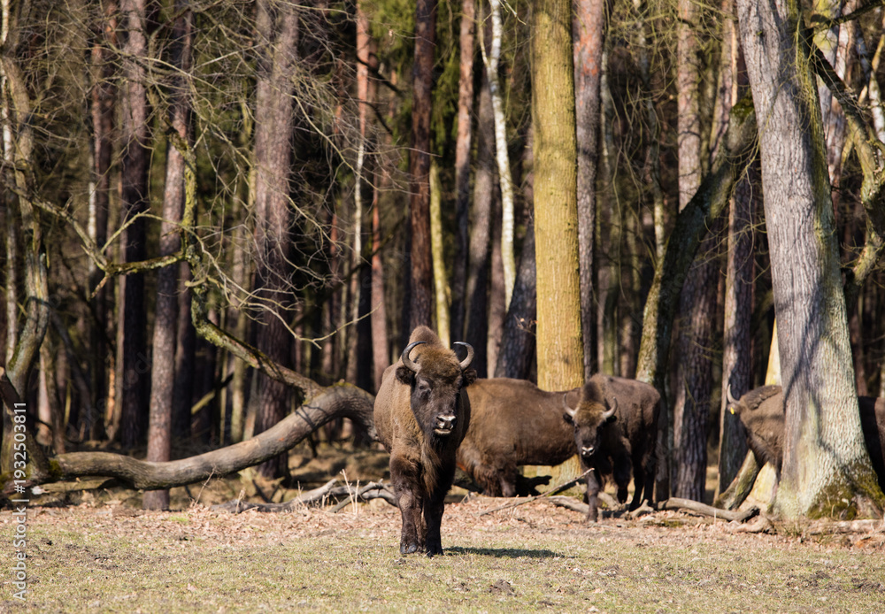 • Stado Polskich żubrów na wiosennej polanie starego lasu